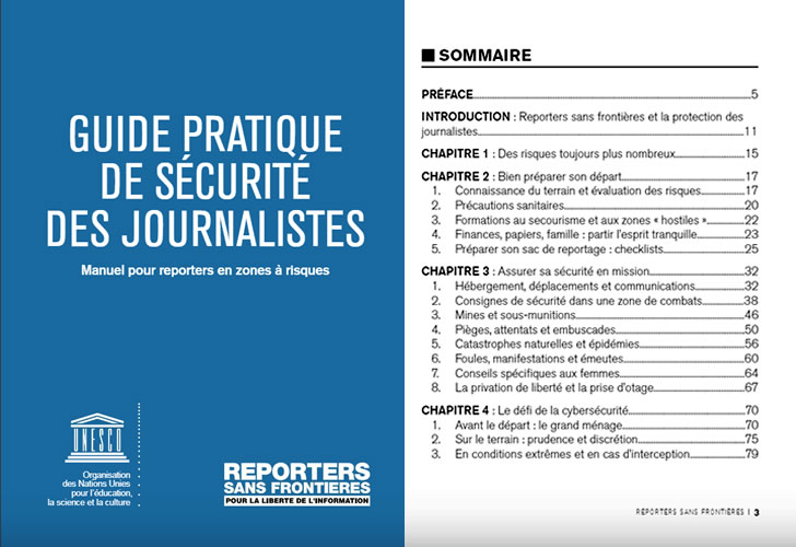 Destiné aux journalistes qui se rendent en mission dans des zones dites «à risques», RSF propose un guide qui dispense des conseils pratiques pour conjurer les dangers du terrain.